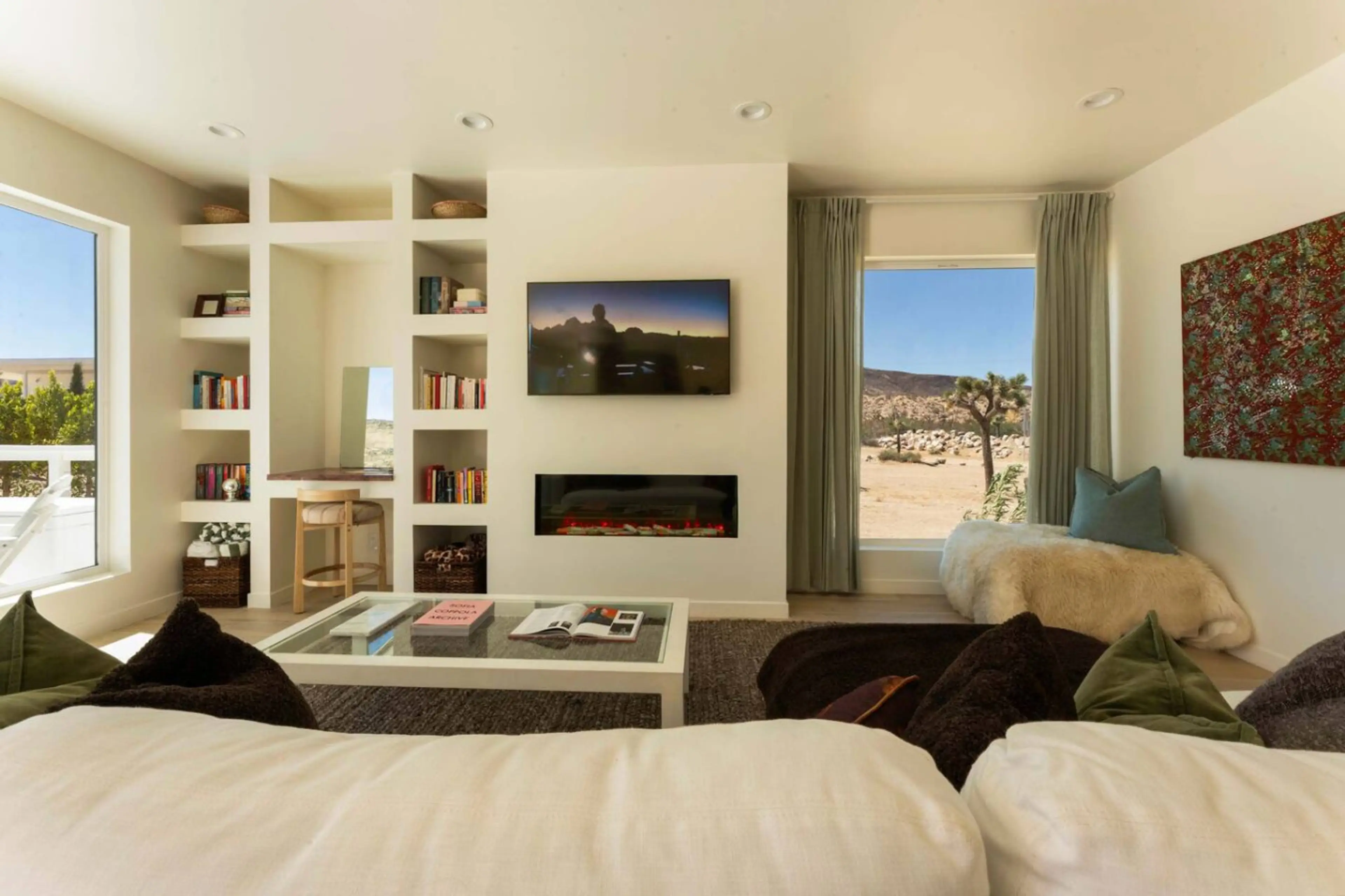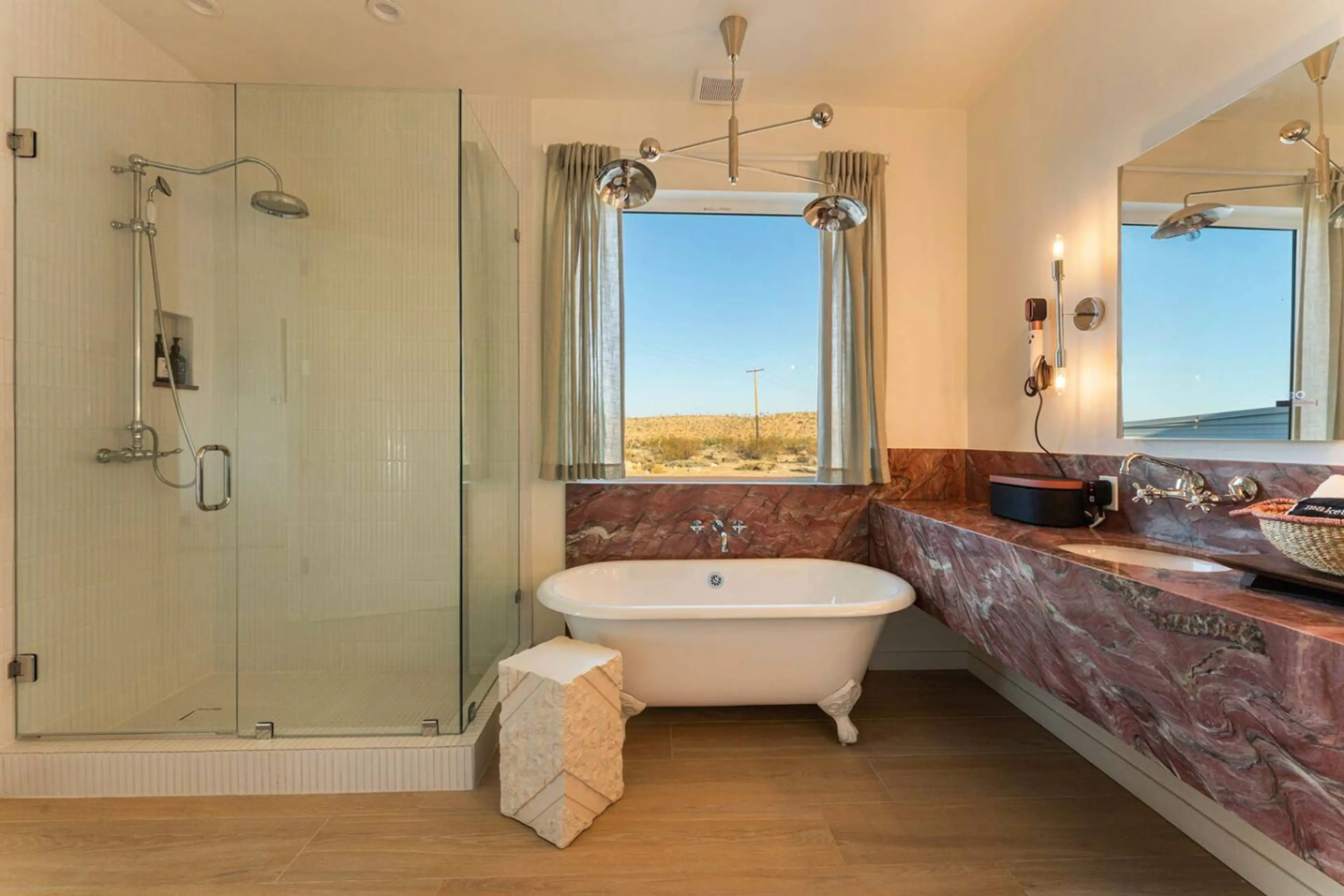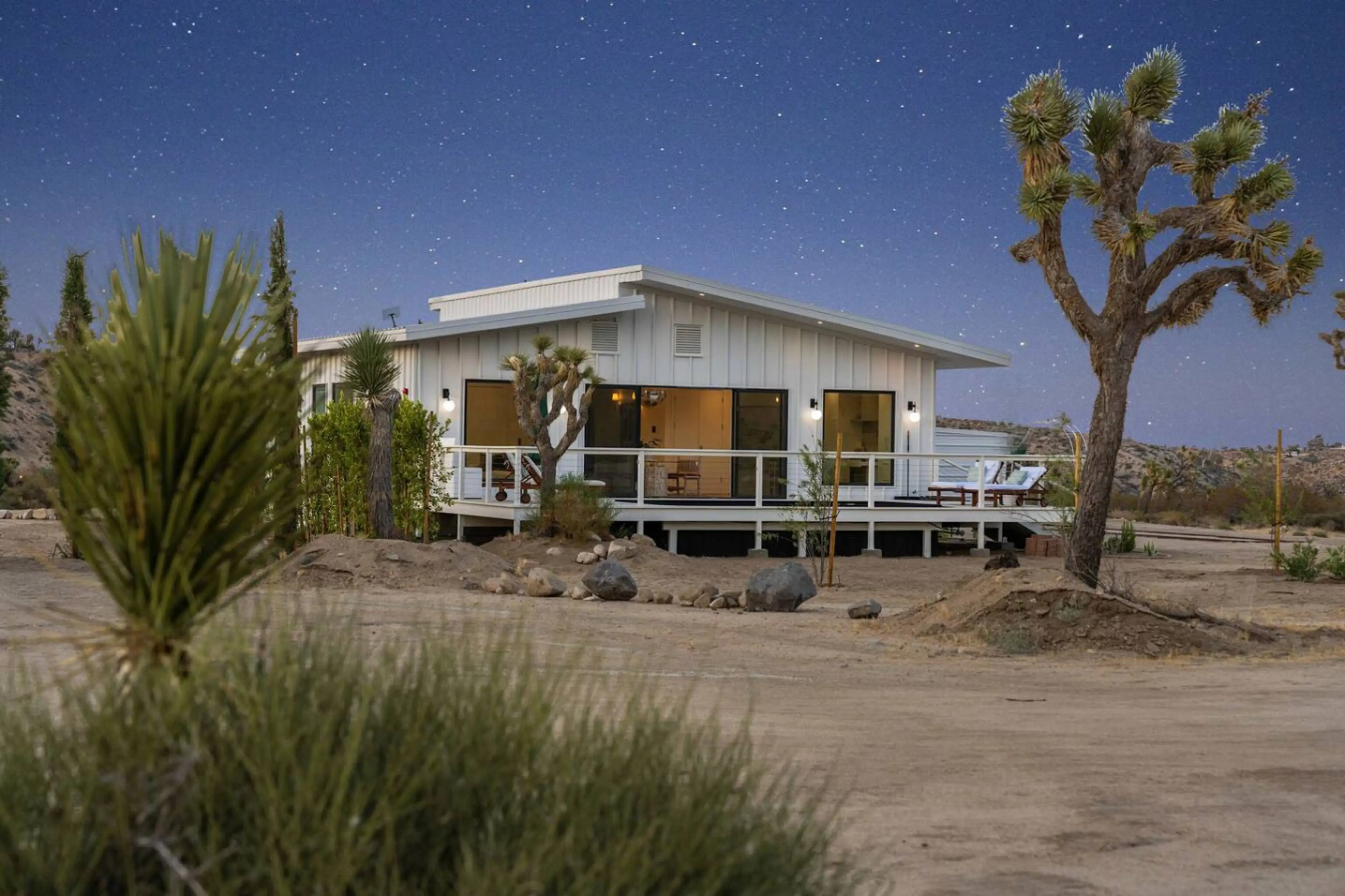 Design-forward 2BR/2.5BA at Little Pipes Ranch in Yucca Valley—minutes to Pioneertown & Joshua Tree NP. Private shipping-container pool + hot tub, hammocks, bocce & desert views. Chef’s kitchen (Bertazzoni), EV charger, fast Wi-Fi, solar + Tesla Powerwalls, whole-house RO well water. Two king suites...